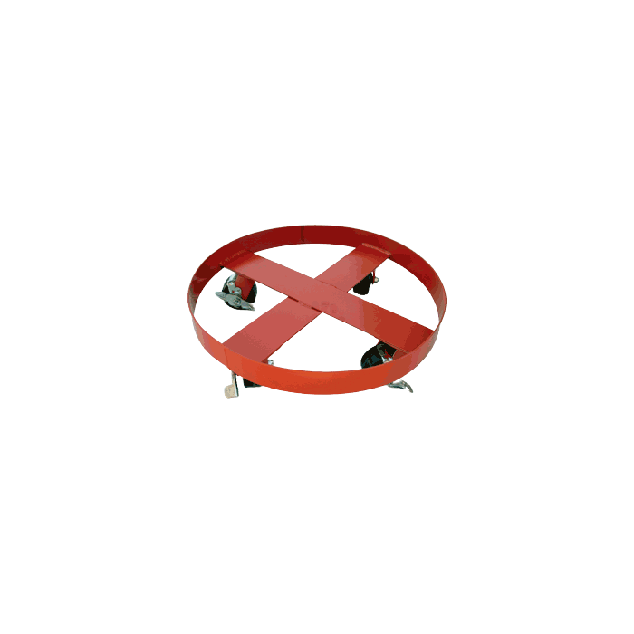 - 55 gallon drum dolly equipped with four, 4" x 2" phenolic swivel casters with brake