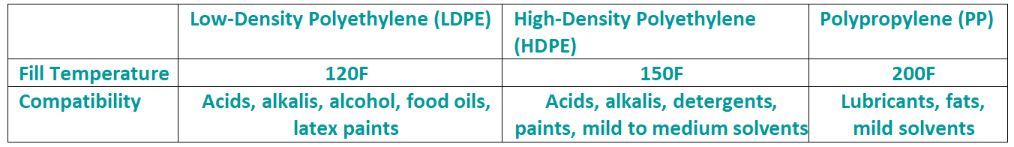 LDPE is the most common material for container liners. They’re typically made with FDA-approved resin, so they’re great for foods, water-based liquids, and other mild products. They won’t hold up with solvents, and you shouldn’t fill product at temperatures of more than 120°F.
