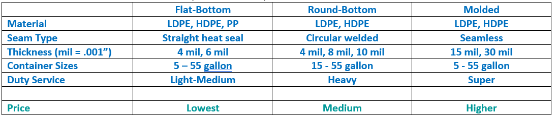 Flat Bag Liners are the most common type. They’re like giant sandwich bags with a straight heat-sealed seam at the bottom. Typically, 4 mil (.004”) or 6 mil (.006”) polyethylene film. For free-flowing liquids, choose a shorter liner that folds back over the top of the container and works with a separate cover disc. For thicker liquids like powders and other dry products, choose a longer liner that gathers at the top and is closed with a twist tie. Flat liners are usually the lowest cost, but the straight seam at the bottom creates folds and pockets as it conforms to the round bottom of the container. Product can get trapped and is more difficult to remove.